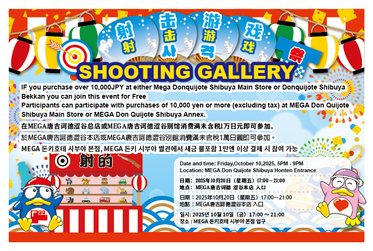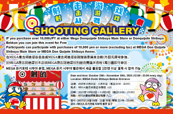 在MEGA唐吉诃德涩谷总店或MEGA唐吉诃德涩谷别馆消费满未含税1万日元即可参加。
